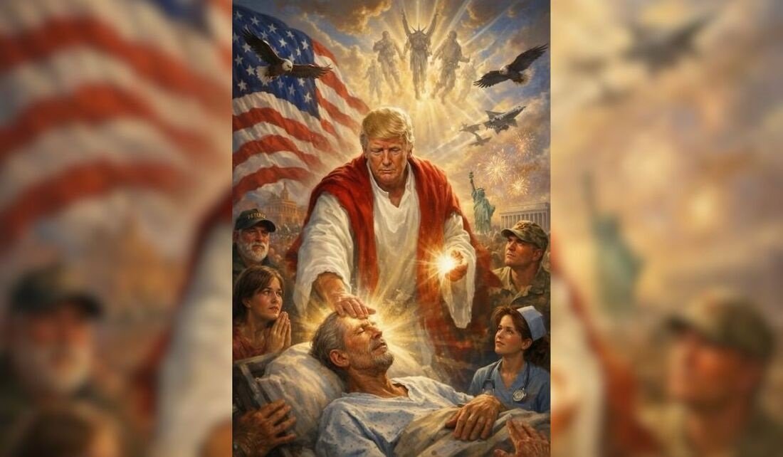 A imagem, publicada na conta do presidente em sua plataforma de mídia social, Truth Social, mostra Trump vestido com vestes brancas e vermelhas. Na ilustração, as mãos do presidente emitem luzes brilhantes, e sua mão direita toca a testa de um homem deitado em uma cama, vestindo uma bata hospitalar.