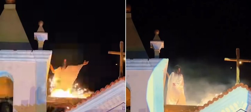 Durante a encenação da Paixão de Cristo em Arraial do Cabo, no Rio de Janeiro, na sexta-feira (3), o ator que interpretava Jesus quase foi atingido por fogos de artifício.