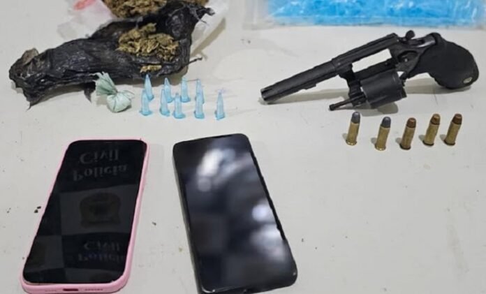 Um revólver calibre .38, com numeração suprimida, duas porções de maconha, nove pinos e uma peteca contendo cocaína, um saco contendo diversos pinos vazios para acondicionamento de substâncias ilícitas e uma motocicleta foram apreendidos.