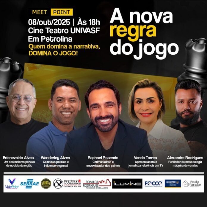 A feira de negócios e palestras ‘A Nova Regra do Jogo’ acontece hoje (8), a partir às 18h, no Cine Teatro da Univasf em Petrolina (PE). A iniciativa é da comunidade empresarial MeetPoint, que conecta empreendedores e líderes da região em experiências de networking e desenvolvimento.