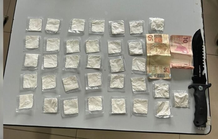 Durante a abordagem, foram encontrados em seus bolsos quatro papelotes de substância análoga à cocaína, a quantia de R$ 60,00 (sessenta reais) em espécie e uma arma branca.