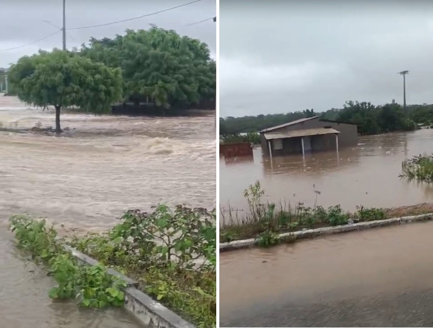 Nas imagens é possível ver a força da água no povoado, que cobriu a pista e invadiu casas. “Nunca vi esse tanto de água”, disse uma moradora.