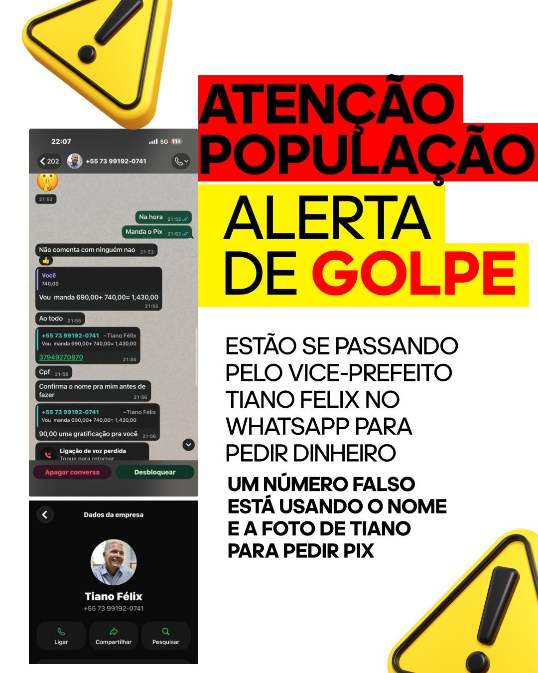 A assessoria do vice-prefeito de Juazeiro Tiano Félix alerta a população sobre um golpe que vem sendo aplicado por meio do WhatsApp, em que criminosos estão utilizando o nome e a imagem do vice-prefeito para solicitar transferências em dinheiro via PIX.