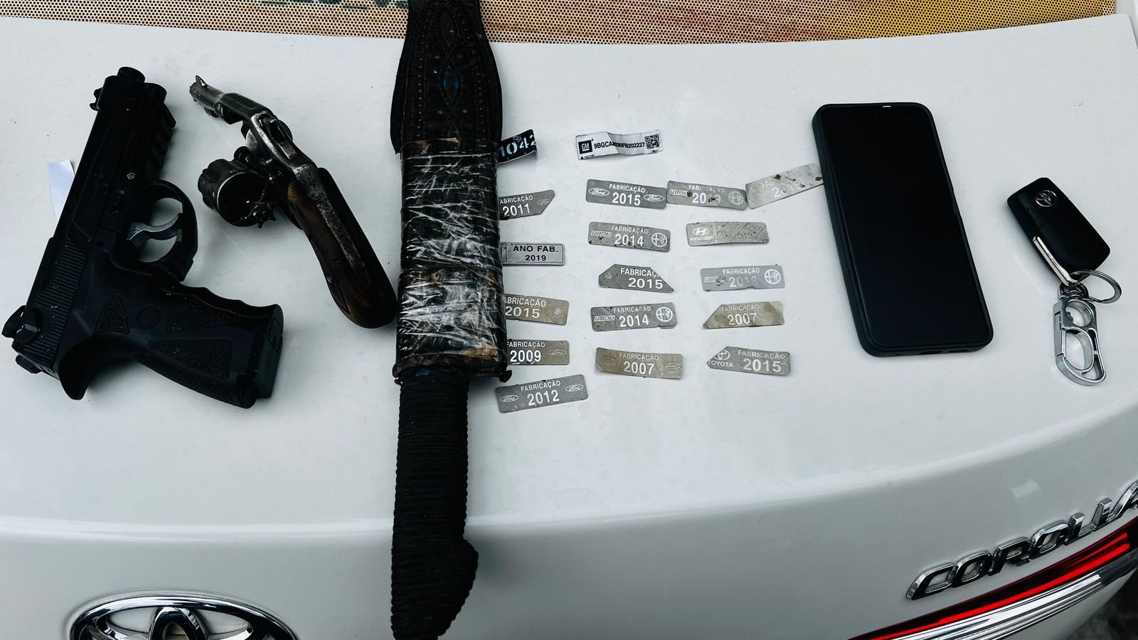 Ao verificarem a placa do automóvel, os agentes descobriram uma restrição relacionada a furto ou roubo na numeração do motor. Ao ser questionado sobre a procedência do veículo, o condutor respondeu que adquiriu durante a troca de um terreno. Também foram encontradas uma faca tipo peixeira; duas armas de fogo; um celular; uma sacola contendo 17 placas de identificação de chassi e 67 fitas de numeração de chassi para colocar no para-brisa e vidros laterais.