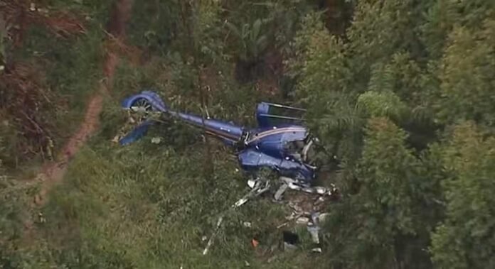Imagens aéreas do local mostram que o helicóptero caiu numa área de mata fechada.