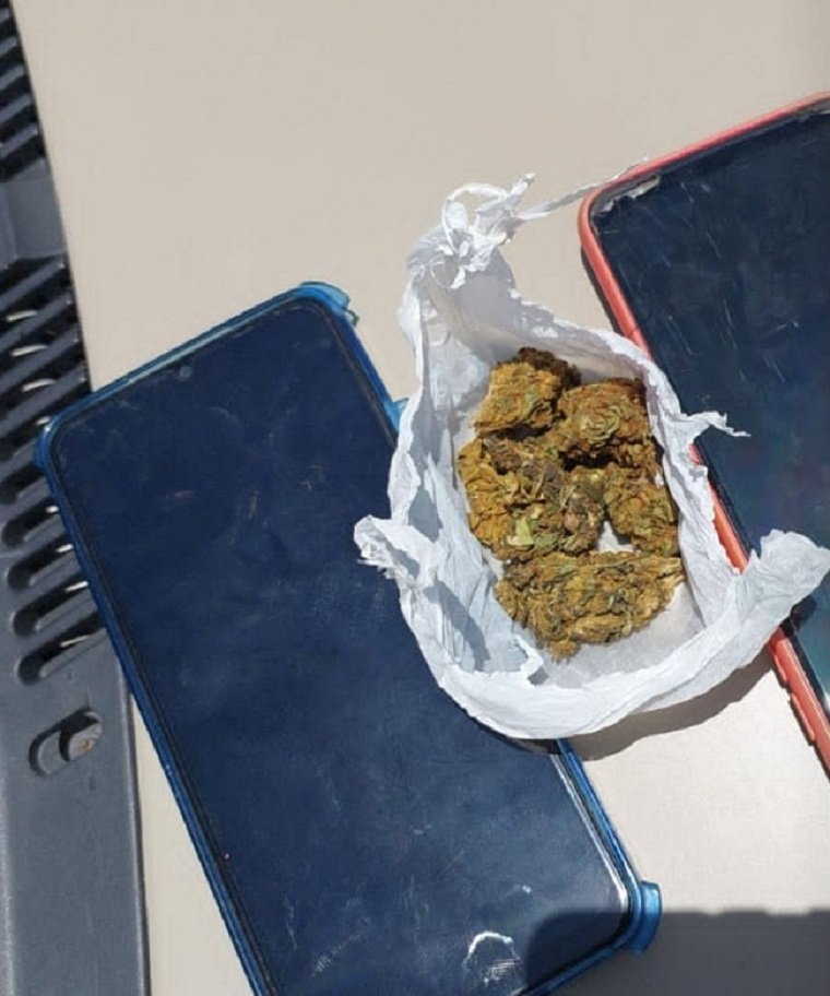Os policiais encontraram uma porção de substância análoga à maconha, acondicionada em invólucro plástico, além de dois aparelhos celulares.
