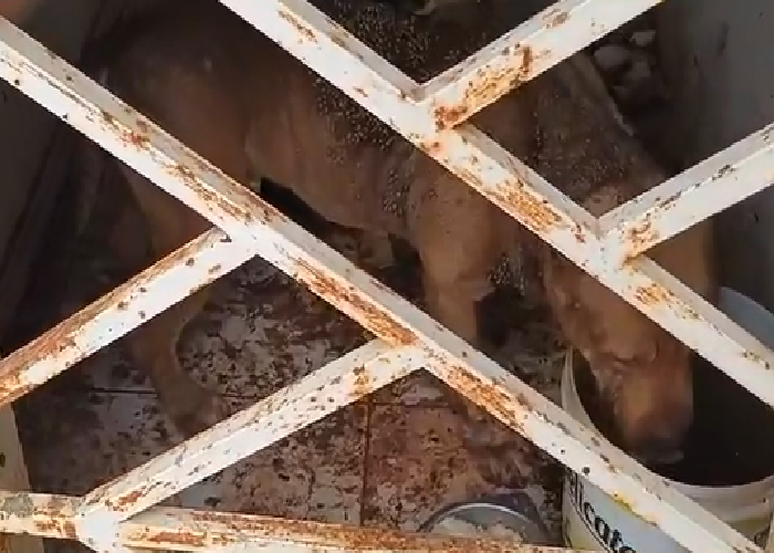 O animal foi encontrado morto no local, apresentando sinais de abandono, desnutrição e infestação de carrapatos, cercado por fezes e restos de comida.