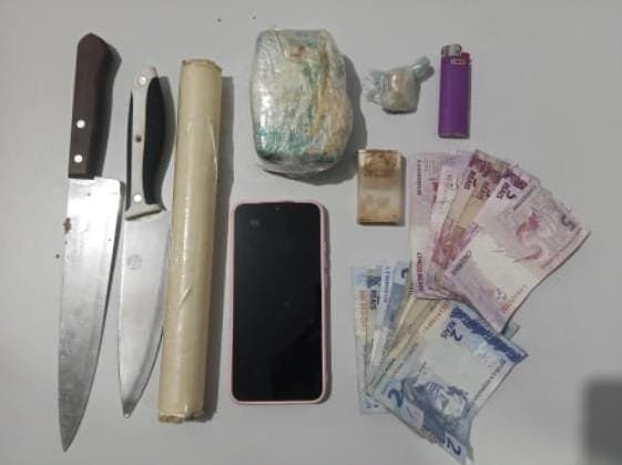 Durante a revista pessoal, foi encontrada uma pedra de 9 gramas de Crack, uma faca do tipo peixeira, quantidade fracionada de pedras da mesma substância, pesando aproximadamente 01 grama, além de um telefone celular e a quantia de R$ 50,00 (valor em dinheiro trocado).