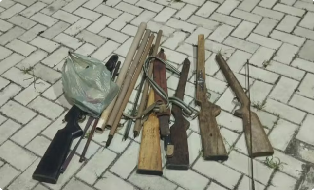 Após o crime, o idoso fugiu e a esposa dele acionou a polícia, pois teve medo de que ele retornasse e continuasse a briga com o filho. Na residência do casal, foram encontradas cinco espingardas e um facão. Os itens foram apreendidos, mas o suspeito não foi encontrado até esta quinta-feira (25). (Foto: PM).