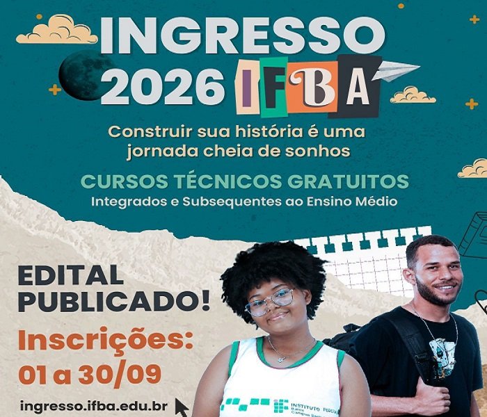 O Instituto Federal de Educação, Ciência e Tecnologia da Bahia (IFBA) publicou na última sexta-feira (29), os editais do processo seletivo para ingresso no ano letivo de 2026 nos cursos técnicos integrados ao Ensino Médio, e para admissão nos cursos técnicos subsequentes ao Ensino Médio. No total, estão sendo ofertadas 5.296 vagas distribuídas por 24 cidades baianas que contam com campi do Instituto.