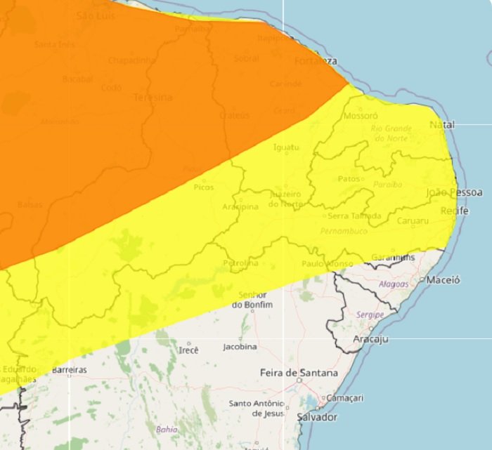 O Instituto Nacional de Meteorologia emitiu o alerta amarelo de chuvas intensas para o Sertão de Pernambuco, válido até às 23h59 desta segunda (20/04).