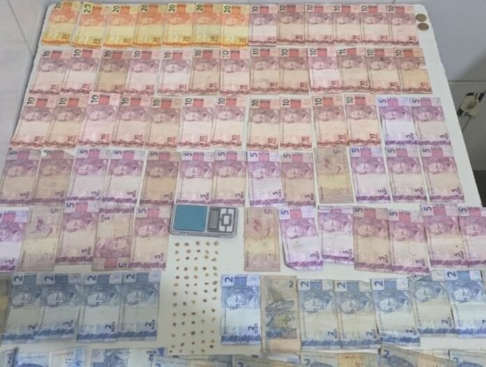 Durante a abordagem, os policiais encontraram com homem 65 pedras de substância análoga a crack; uma balança de precisão; e R$ 627,50 em espécie.