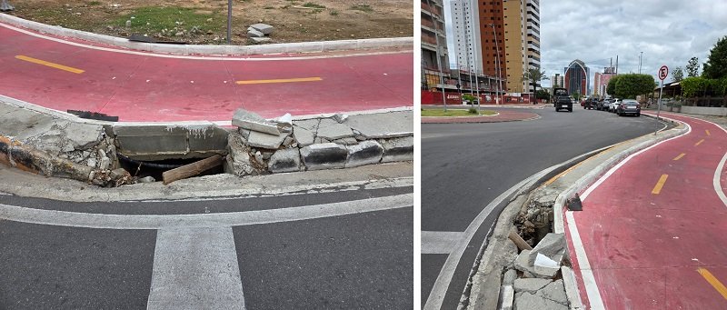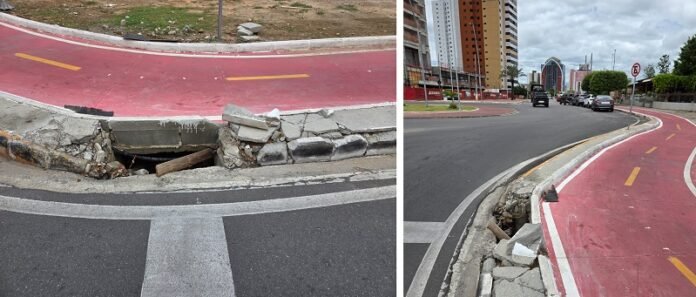“Esse buraco fica em frente ao restaurante Bêra D’água. A construtora que fez a obra da Orla 3 já refez três vezes, e muito mal feito, literalmente usando péssimos materiais, dos quais o correto é ferro e concreto usinado. Está assim já tem uns quatro meses, os carros passam ali e batem nessa estrutura; se não for bem feito, sempre irá dar nisso aí”, disse.