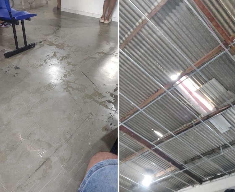 “Cadê a prefeitura que não vê isso? Telhado sem condições nenhuma, o forro já caiu só tem as ferragens que o forro era de PVC, olha o buraco no telhado. Toda vez que chove o posto de saúde fica cheio de água. É uma vergonha”, disse.