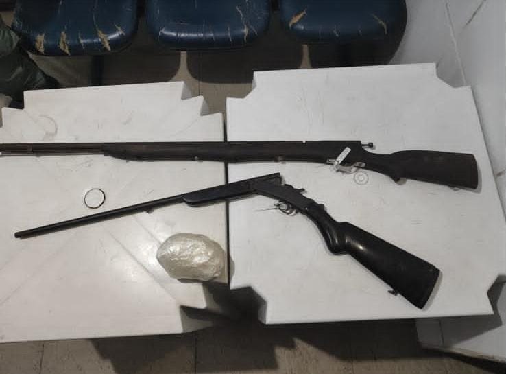 Foram apreendidas uma espingarda industrial calibre 40, uma espingarda artesanal do tipo ante carga e 757 gramas de cocaína. Todo material apreendido foi conduzido à Delegacia de Polícia Civil, onde foram apresentados para serem adotadas as medidas legais cabíveis. (Foto: PM).