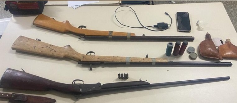 O suspeito foi localizado.  Ao ser questionado sobre os fatos e acerca da existência de armas, ele confirmou possuir o material e autorizou a entrada da guarnição no imóvel. No local, foram encontrados os seguintes itens: