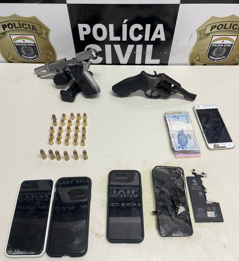 Policiais da 214ª e da 213ª Delegacias Circunscricionais identificaram e localizaram os suspeitos na área central de Petrolina. No momento da captura, foram apreendidas duas armas de fogo — uma pistola calibre .380, acompanhada de dois carregadores municiados, e um revólver calibre .38 municiado — além da motocicleta, capacete e aparelho celular pertencentes à vítima do latrocínio.