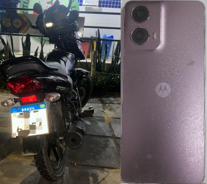 Foi realizada a abordagem e encontrado com o garupa um aparelho celular da marca Motorola, modelo G24, de cor rosa, IMEI 355604125621631, que o mesmo informou pertencer a sua irmã.