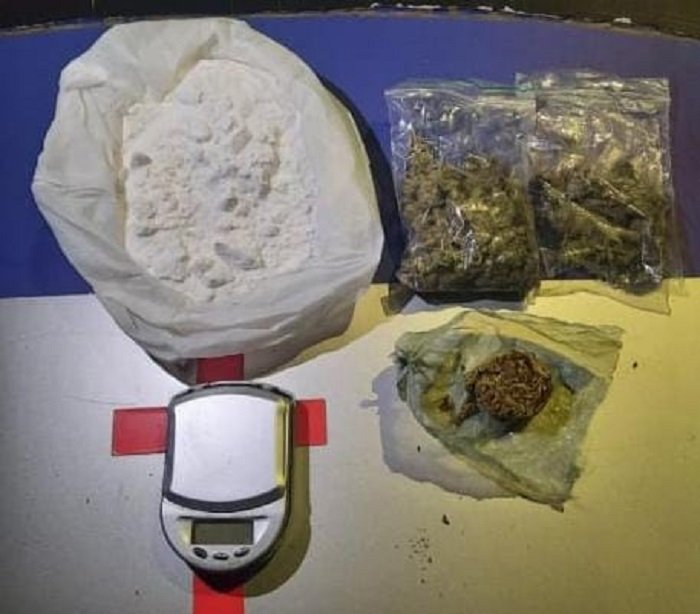 Uma sacola plástica foi encontrada no local contendo 555 gramas de cocaína e 35 gramas de maconha e uma balança de precisão.