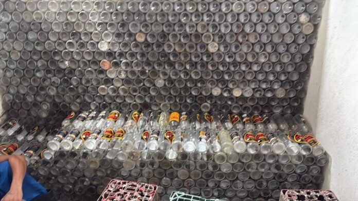 Também foram encontradas garrafas de marcas conhecidas que seriam possivelmente reutilizadas para comercialização fraudulenta, configurando falsificação de marca e colocando em risco a saúde dos consumidores. O maquinário utilizado na produção ilegal foi apreendido. (Foto: Polícia Civil de Pernambuco/Divulgação).