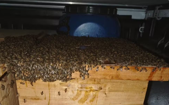 De acordo com um dos técnicos em agropecuária que fez a retirada do enxame do local, acionado pela prefeitura da cidade, o enxame estava alojado no espaço vazio formado sob a laje da escada de um quiosque localizado em frente à pista.