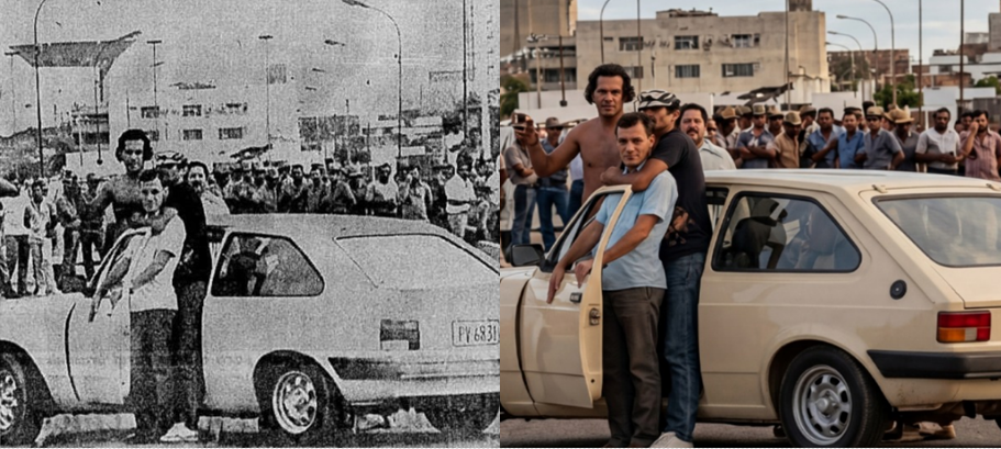 Na imagem, a família sequestrada dentro do carro, o bispo sendo refém, o público e por trás também aparece  Edenevaldo Alves (sem camisa), que à época era repórter da rádio Grande Rio AM.