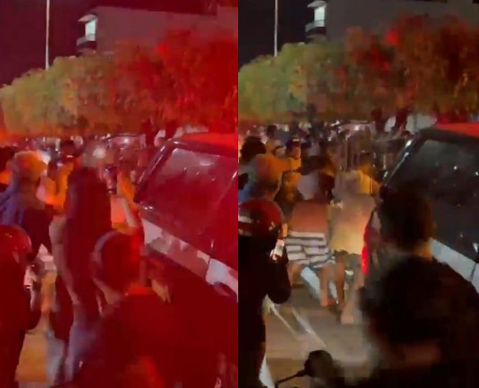 Vídeos compartilhados nas redes sociais mostram o momento. Alguns populares tiram o homem da viatura à força, o jogam no chão e começam a espancá-lo, com chutes e murros.
