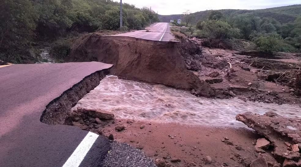 Uma cratera se abriu na ponte que liga Piranhas a Canindé de São Francisco (SE). O Corpo de Bombeiros de Sergipe informou que um carro foi arrastado pela água e localizado na tarde do sábado. Um casal de Canindé de São Francisco estava no veículo. A mulher morreu e o esposo dela ainda está desaparecido.