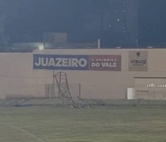 Uma das torres de iluminação do Estádio Adauto Moraes, em Juazeiro (BA), desabou, após uma forte ventania da tarde deste domingo (8).